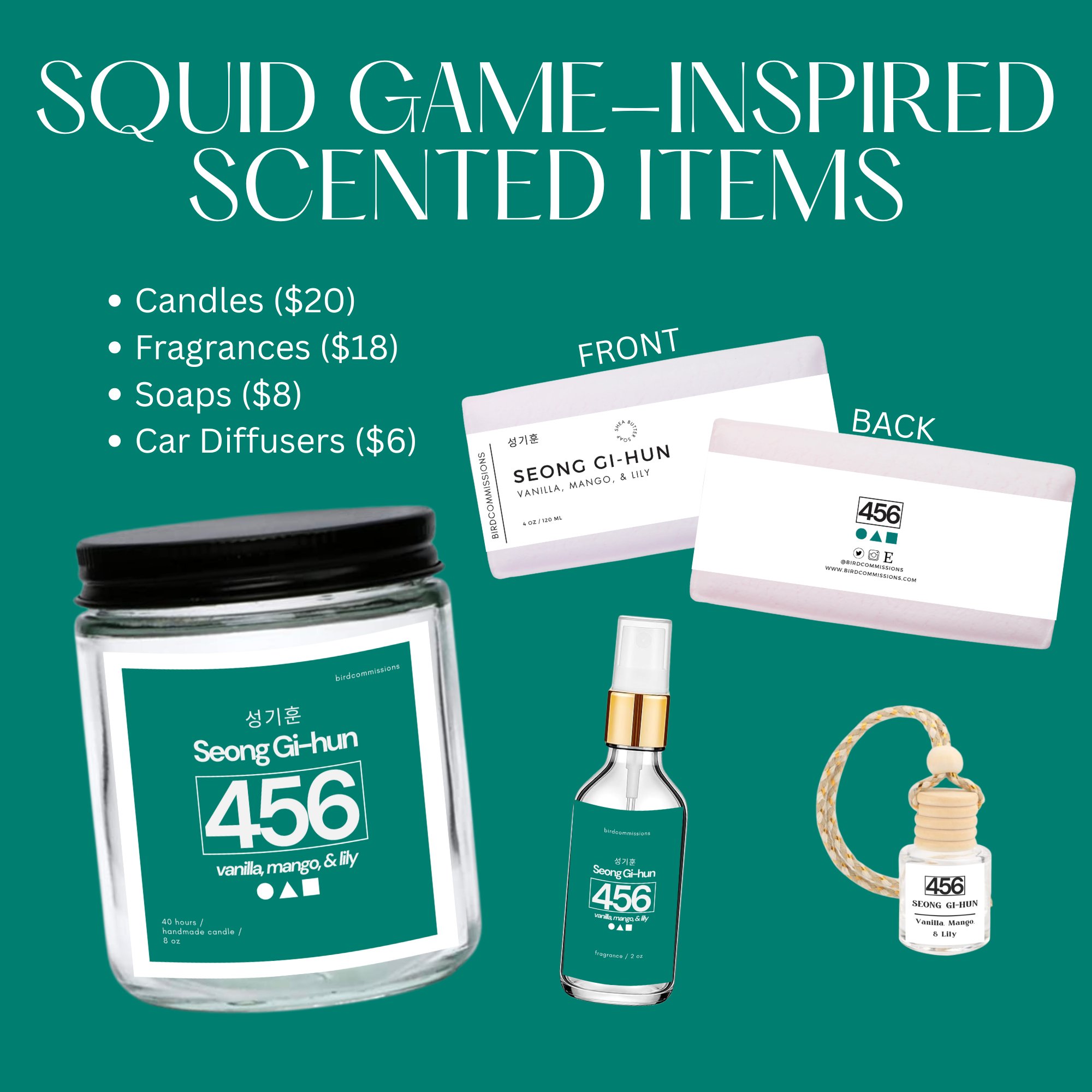 You can buy a candle, fragrance, soap, or car diffuser through this listing! Scents for each character are at the bottom of the description.